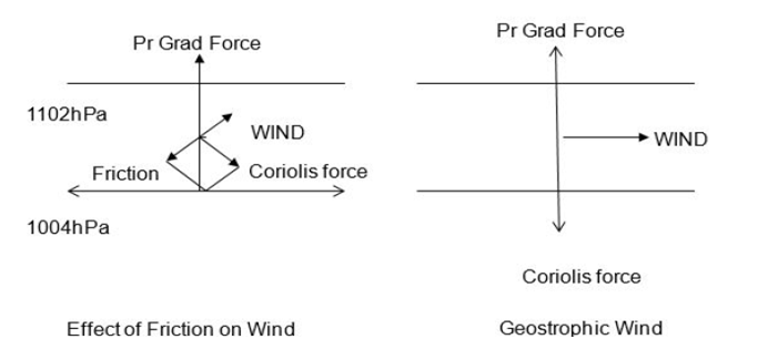 The rough terrain causes friction. Depending upon wind speed, lapse rate and roughness of the surface, effect of friction may extend to about 1 km. This layer is called friction layer. Thickness of the layer is variable. Within the friction layer wind slows down and the Coriolis force reduces proportionately and is insufficient to balance Pressure Gradient Force. The wind is therefore, deflected towards the low pressure and the flow become cross isobaric.